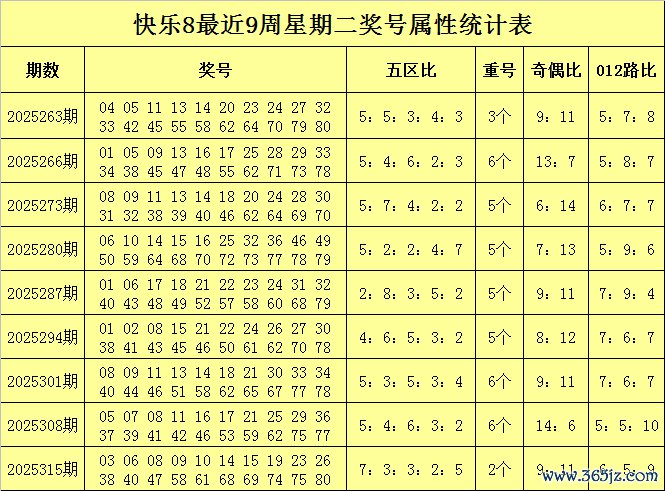 012路比分析:最近9周星期二奖号012路总比为53:62:65,最近3周星期二奖号012路总比为18:16:26,上周星期二奖号012路比为6:5:9。